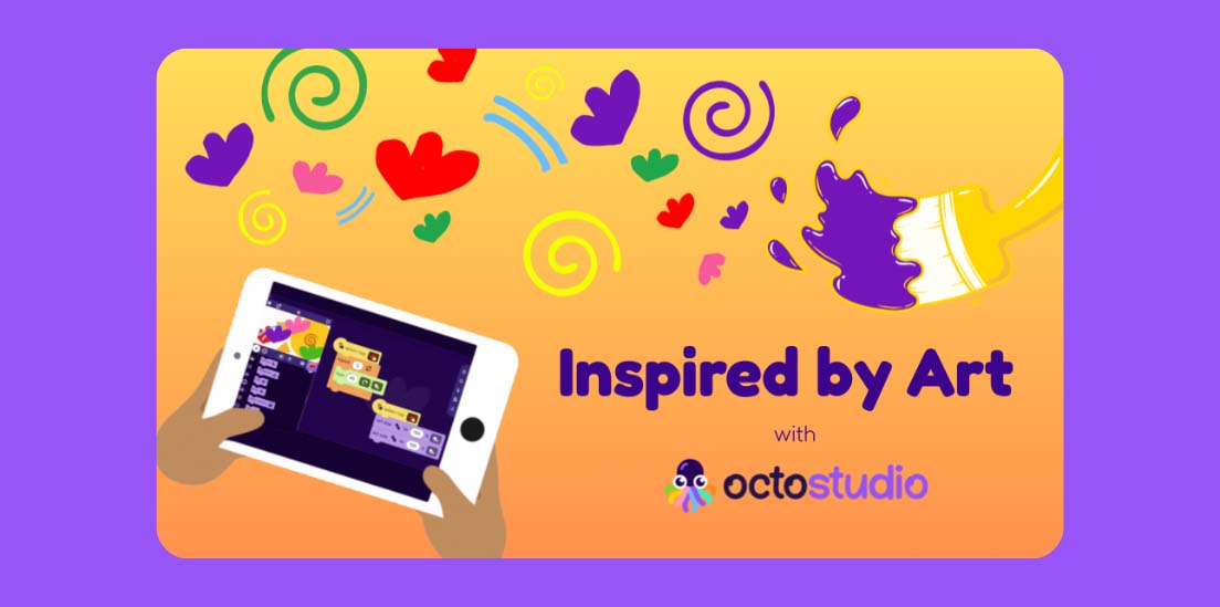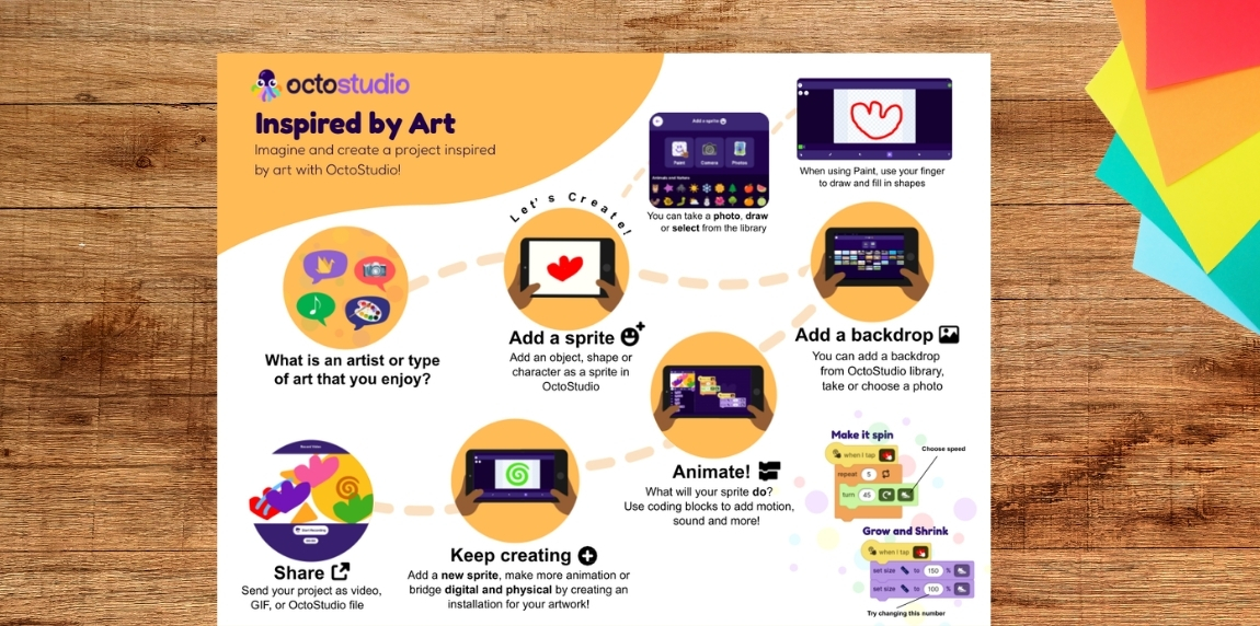The coding cards offer helpful starting points for learning to code projects in OctoStudio.